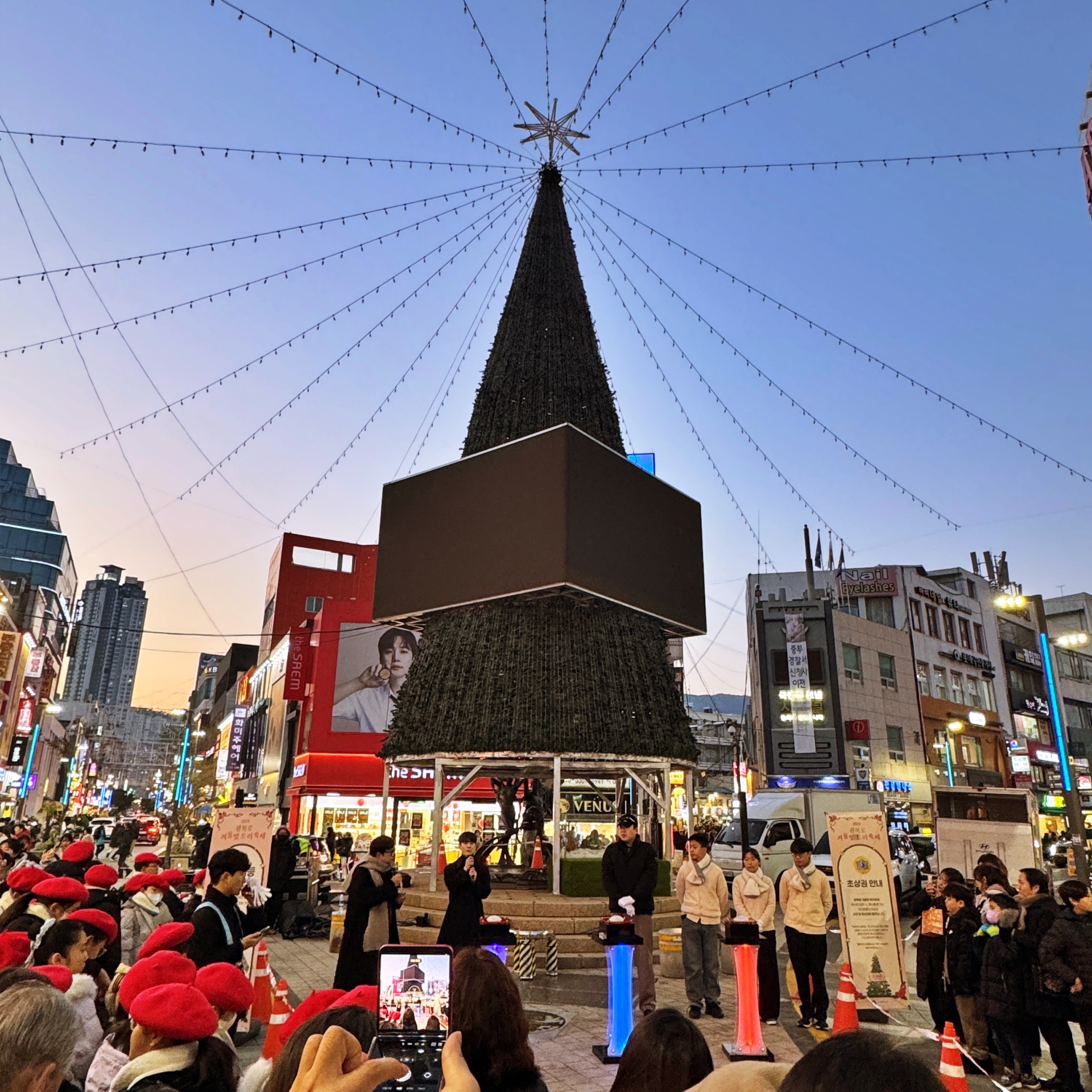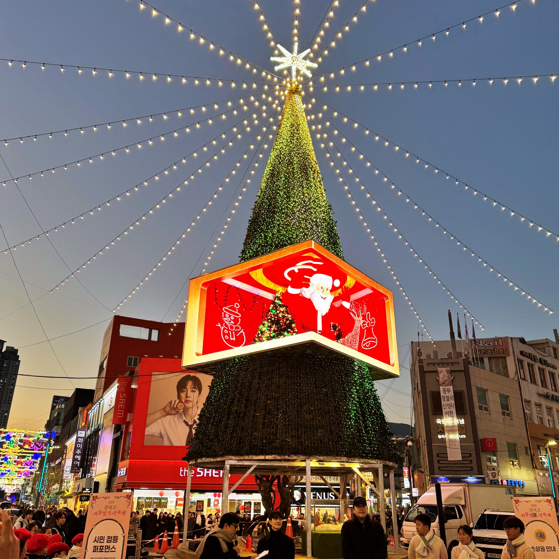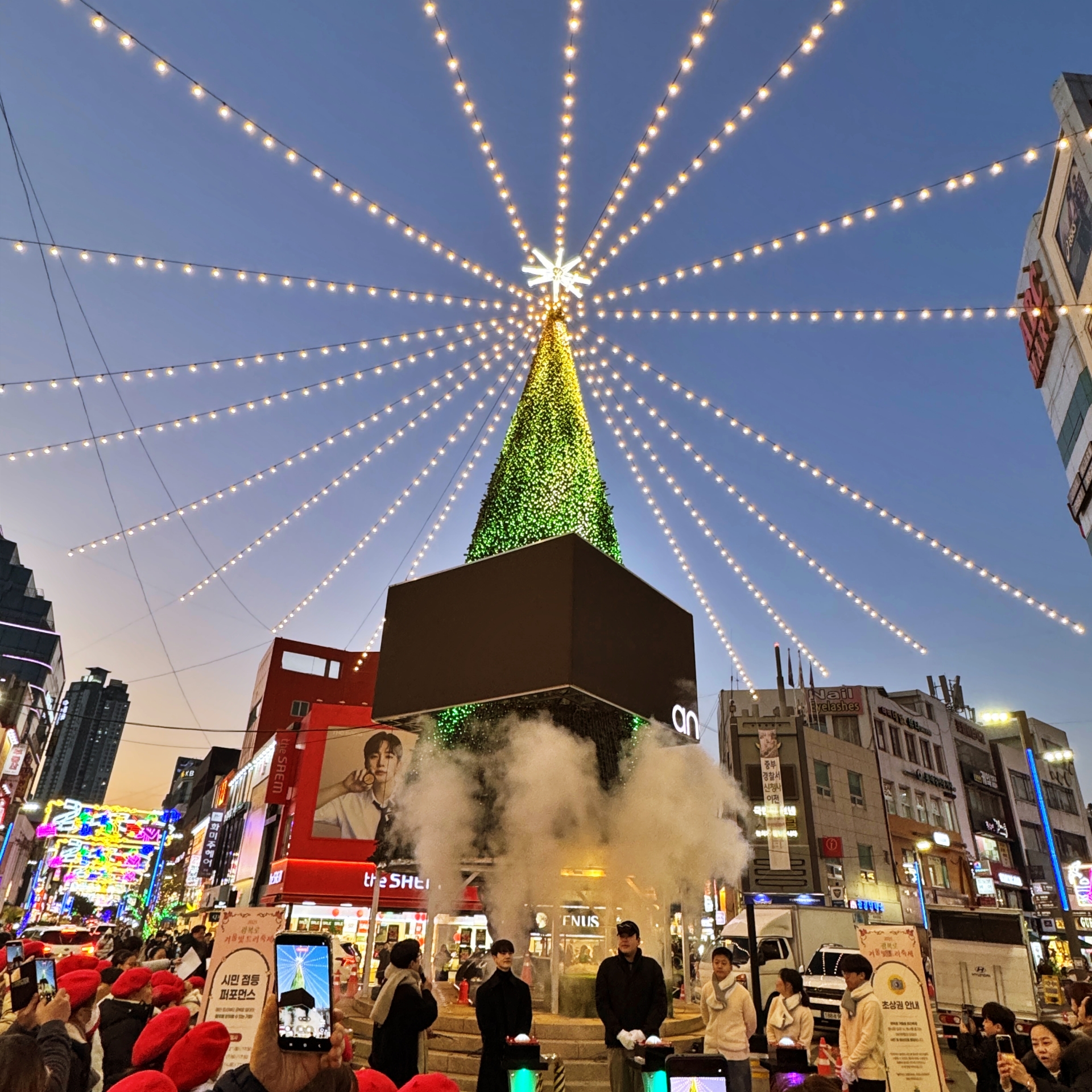 우리가 광복로를 찾았을 때에는 광장 중앙 메인 무대에서는 시민이 직접 트리 불빛을 켜 볼 수 있는 참여향 점등식이 열리고 있었다. 참여 시민들이 카운트다운과 함께 점등을 하는 수간 화려한 트리 조명광복로 일대를 가득 채워나간다.