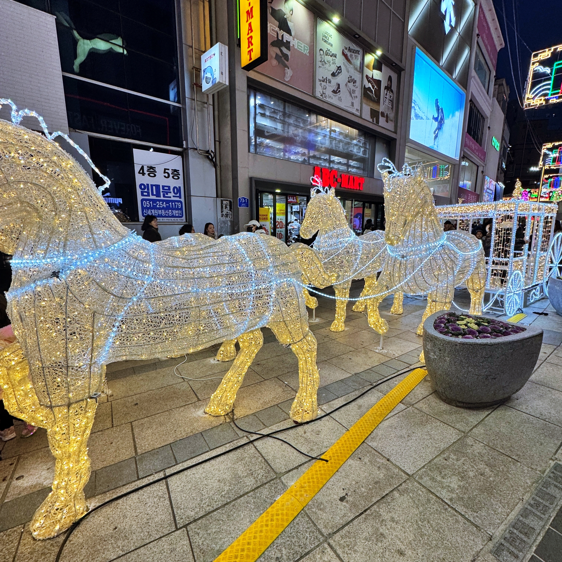 광복로를 따라 양쪽으로 늘어선 가로수들도 빛의 옷을 둘러 입었다. 눈부신 조명을 밝힌 말들이 끄는 황금마차와 온기 간직한 귀여운 눈사람과 펭퀸은 아이들에게 인기만점이다.작고 귀여운 눈사람과 펭귄 옆에는 추위를 잊은 아이들의 동심이 어우러져 보기만 해도 흐뭇한 장면이 펼쳐진다. 거리의 빛을 발하는 모든 것이 예뻐 자꾸 카메라에 담고 싶어진다.